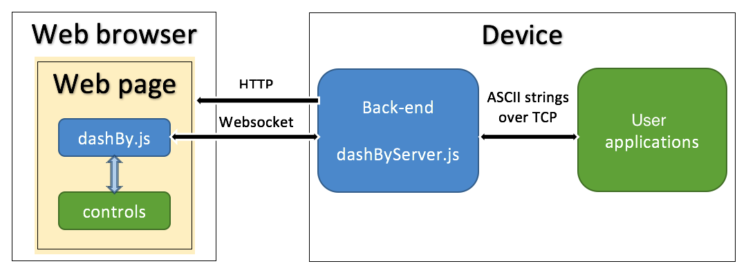 User applications can connnect the back-end on dedicated TCP port (default 8000) and use text strings to exchange with web page controls as well as between each other. Simply put, dashByServer.js works as 'chat-room' for all connected clients and web pages.
